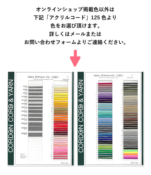 アクリルコードのサンプルカードには、AC66AとAC1010Aの太さ見本は掲載しておりません。色は、【アクリルコード】125色よりお選びいただけますので、サンプルカードを参考にしていただけます。HP掲載色のC/#66 (赤) 以外の色をご注文される場合は、お問い合わせフォームまたは、info@cordon.jpよりお問い合わせください。 |