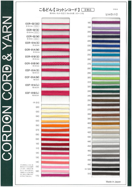こるどん【コットンコード】の太さ見本と色見本を掲載したサンプルカードです。
