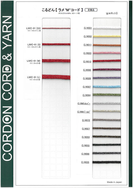 こるどん【ラメ”M”コード】の太さ見本と色見本を掲載したサンプルカードです。