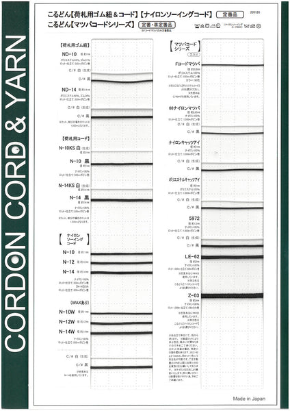 荷札用ゴム紐&コード・ナイロンソーイングコード・マツバコードシリーズサンプルカード A4サイズ(210mm×297mm)