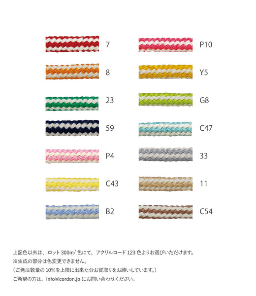 | 別注色について | ロット300m/色にて、【アクリルコード】123色よりお選びいただけます。 |