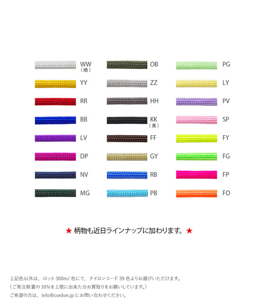 ロット300m/色にて、【ナイロンコード】39色よりお選びいただけます。 |